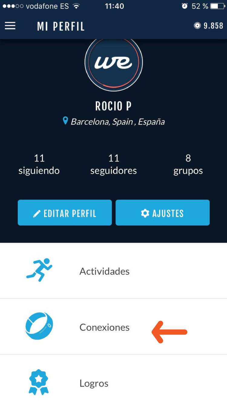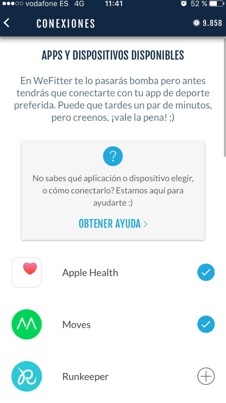 2. En el apartado de conexiones, verás una lista de aplicaciones con las que podrás registrar tu actividad física. Necesitarás usar una de ellas para poder sumar puntos en WeFitter. Elige alguna que ya uses y si no tienes ninguna, la que quieras. Pulsando en cualquiera de ellas desde nuestra app podrás acceder a una completa descripción y al link de descarga.